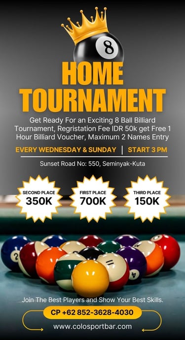 Enjoy special discounts on billiard sessions at Colo Sport Bar ! Whether you're a beginner or an expert, come play on our top-tier tables and take advantage of exclusive drink deals. Visit us in Seminyak and join the fun. Book your spot today!
